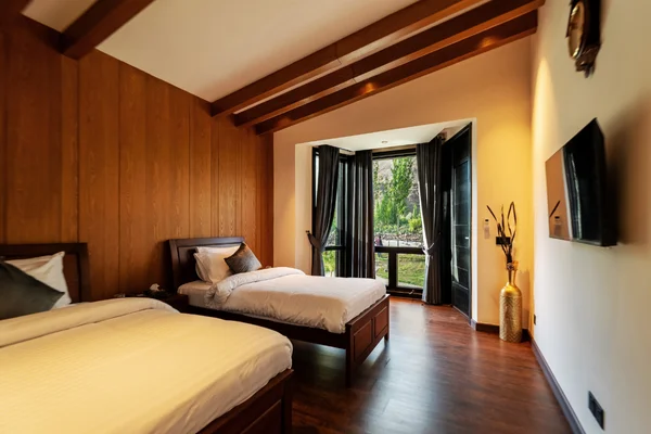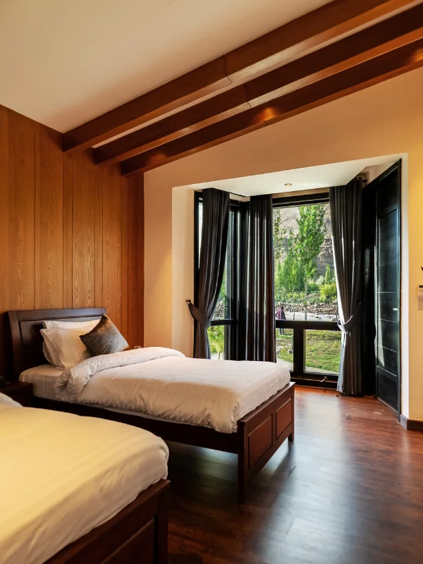 The Deluxe Twin Room at Cascade Resorts Skardu is designed for comfort and relaxation with a touch of modern elegance. Each room features twin beds with soft linens, warm wooden interiors, and large panoramic windows overlooking the lush valley.