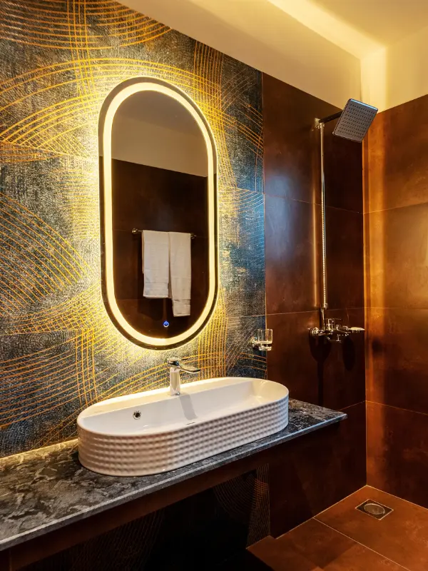 Indulge in spa-inspired comfort with a stylish vanity mirror, rainfall shower, and fine lighting that enhances the soothing brown-gold aesthetic. Perfect for a refreshing start or a calming end to your day together.