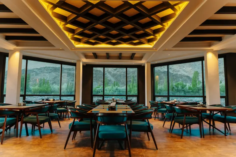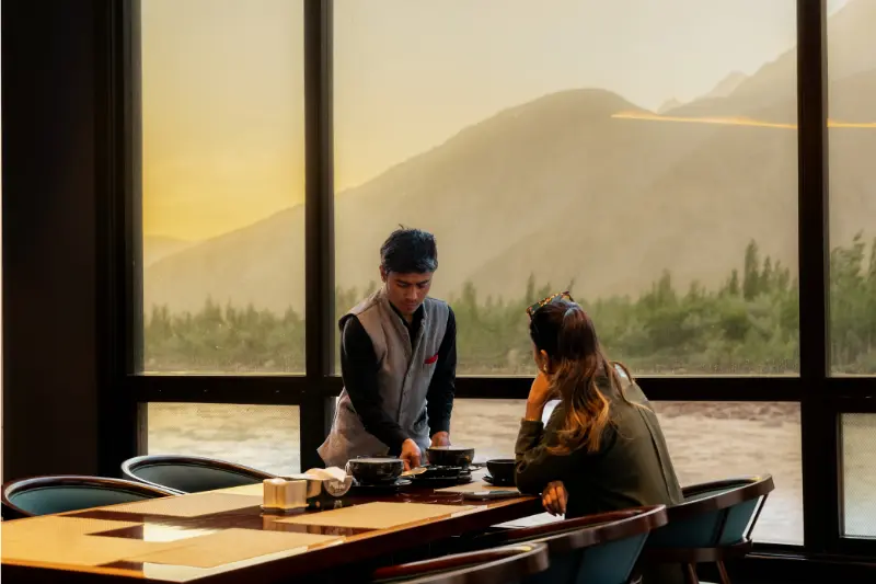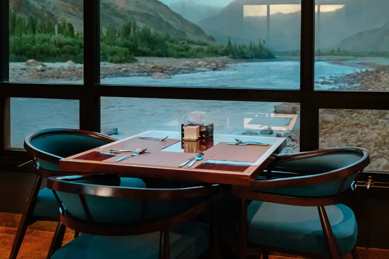 Our panoramic dining area offers one of the most stunning views in the entire region. Large glass windows open up to the majestic Shyok River, lush tree lines, and distant rocky cliffs, bringing the beauty of the outdoors right to your table.